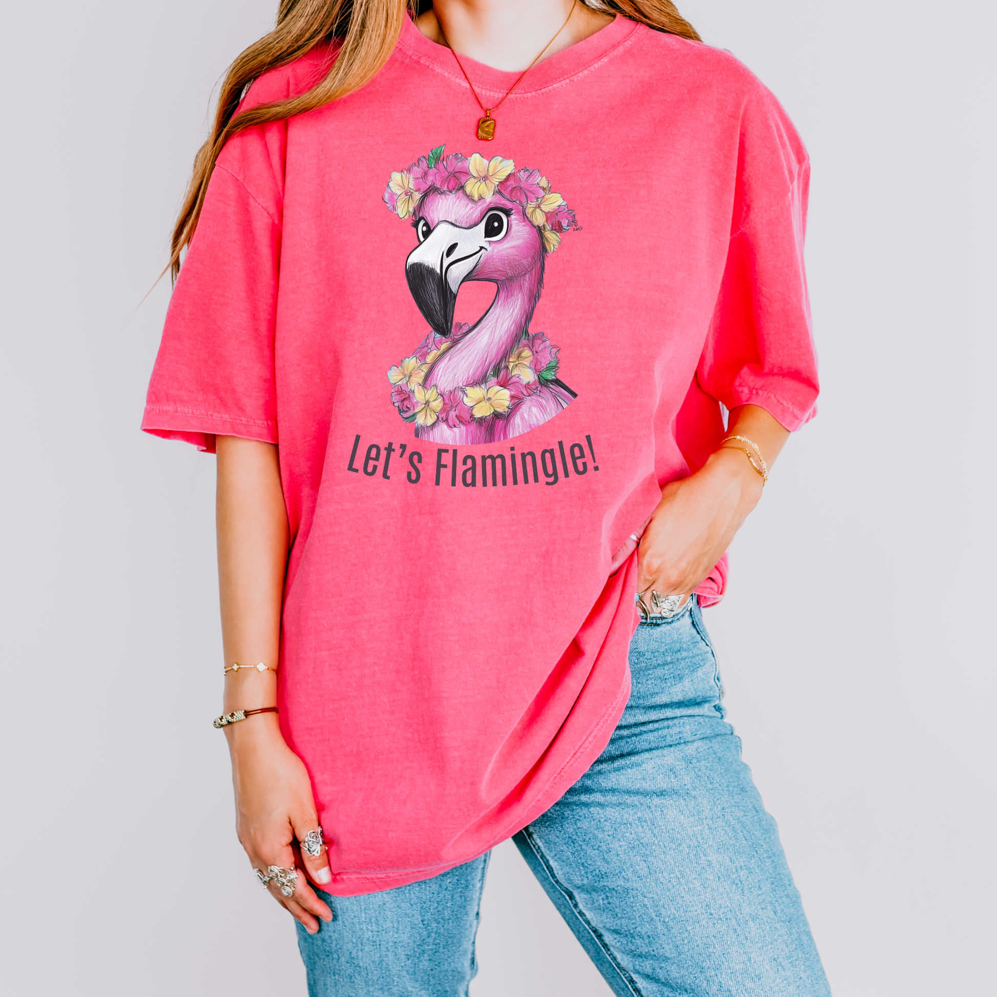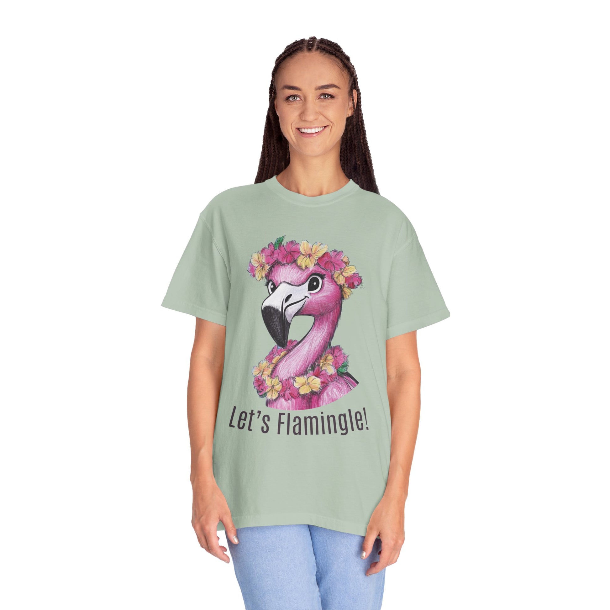 This Let's Flamingle Flamingo Beach T-shirt exudes a fun and tropical vibe, perfect for beach vacations, summer parties, and tropical-themed events.