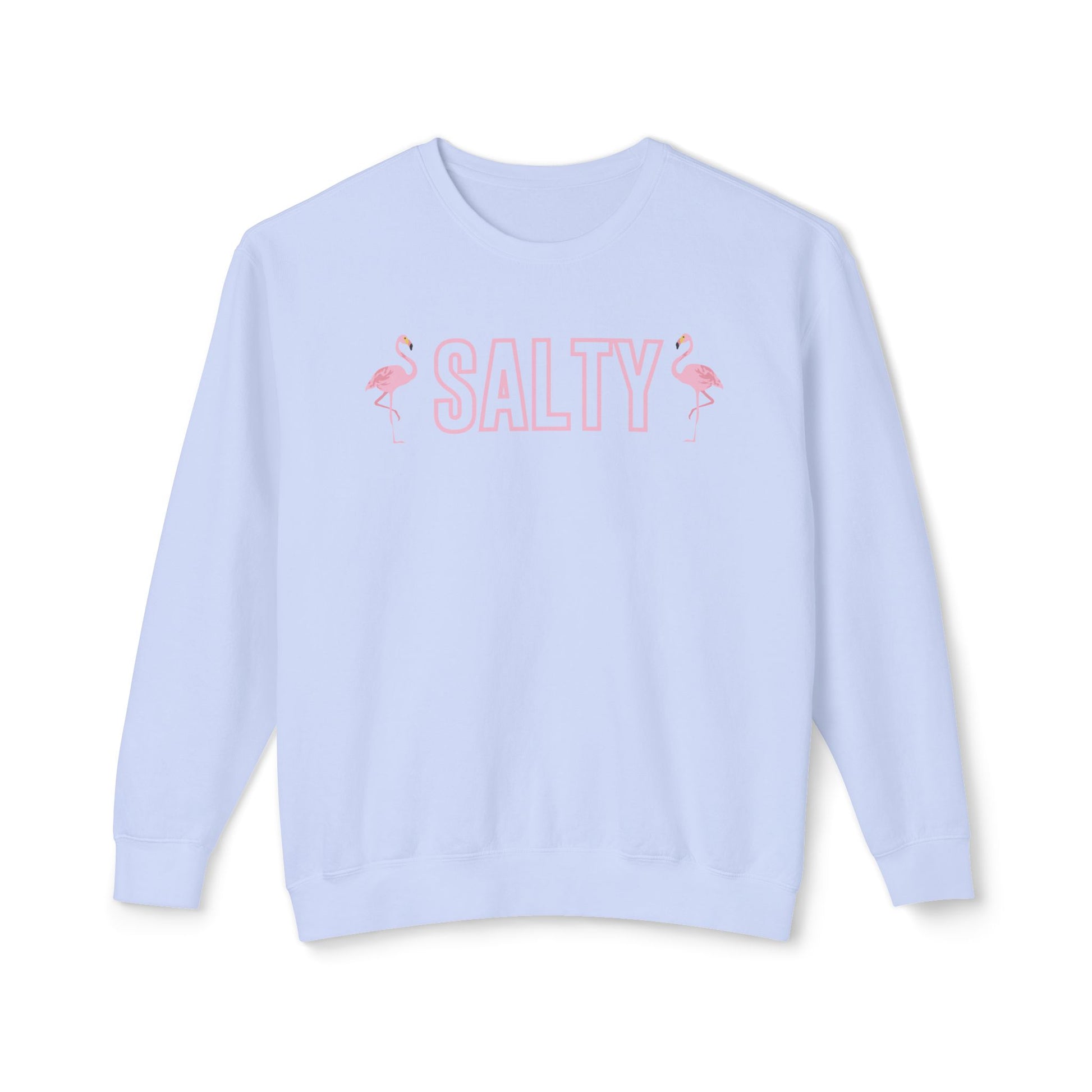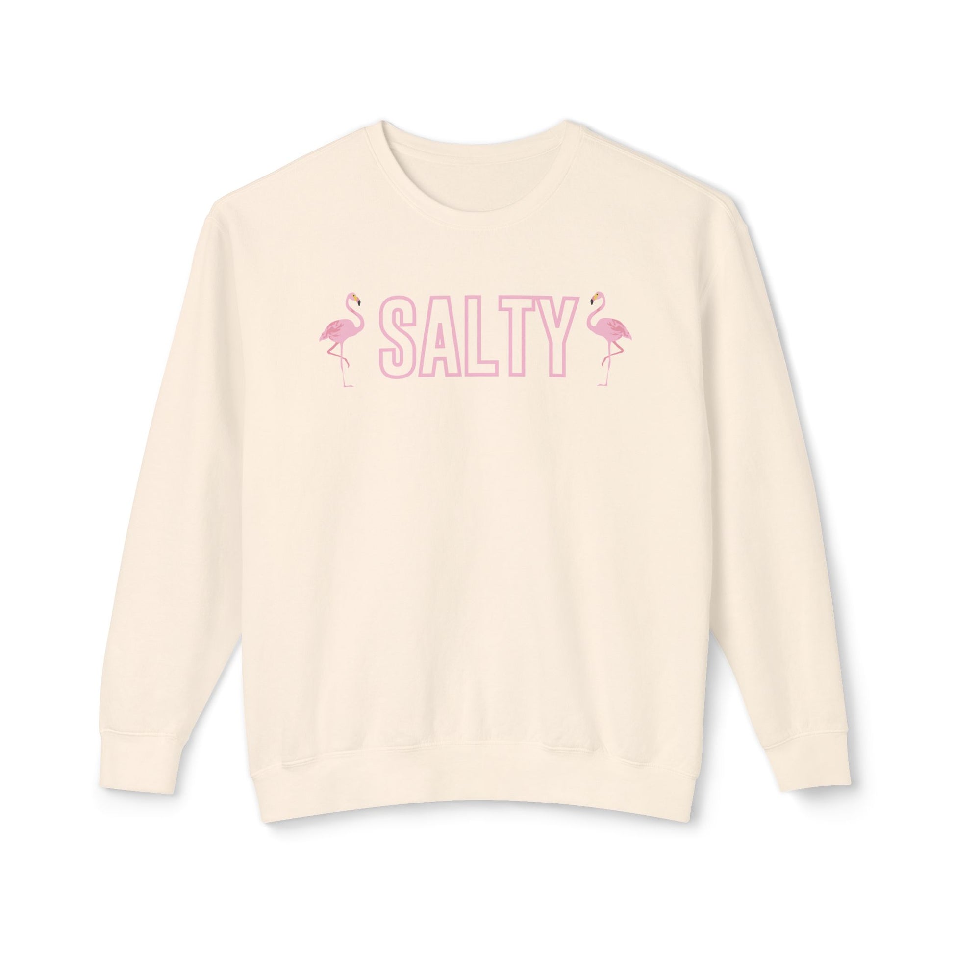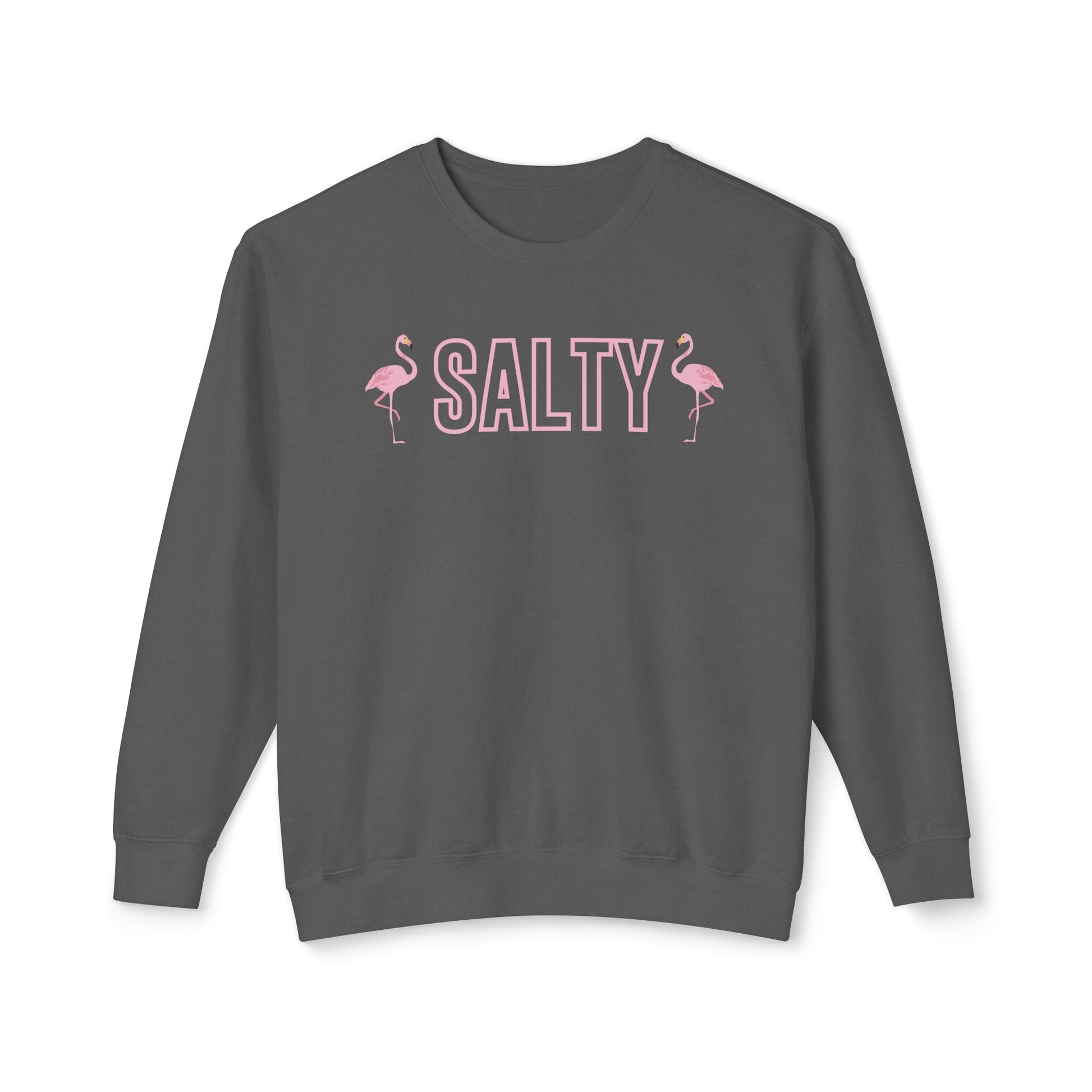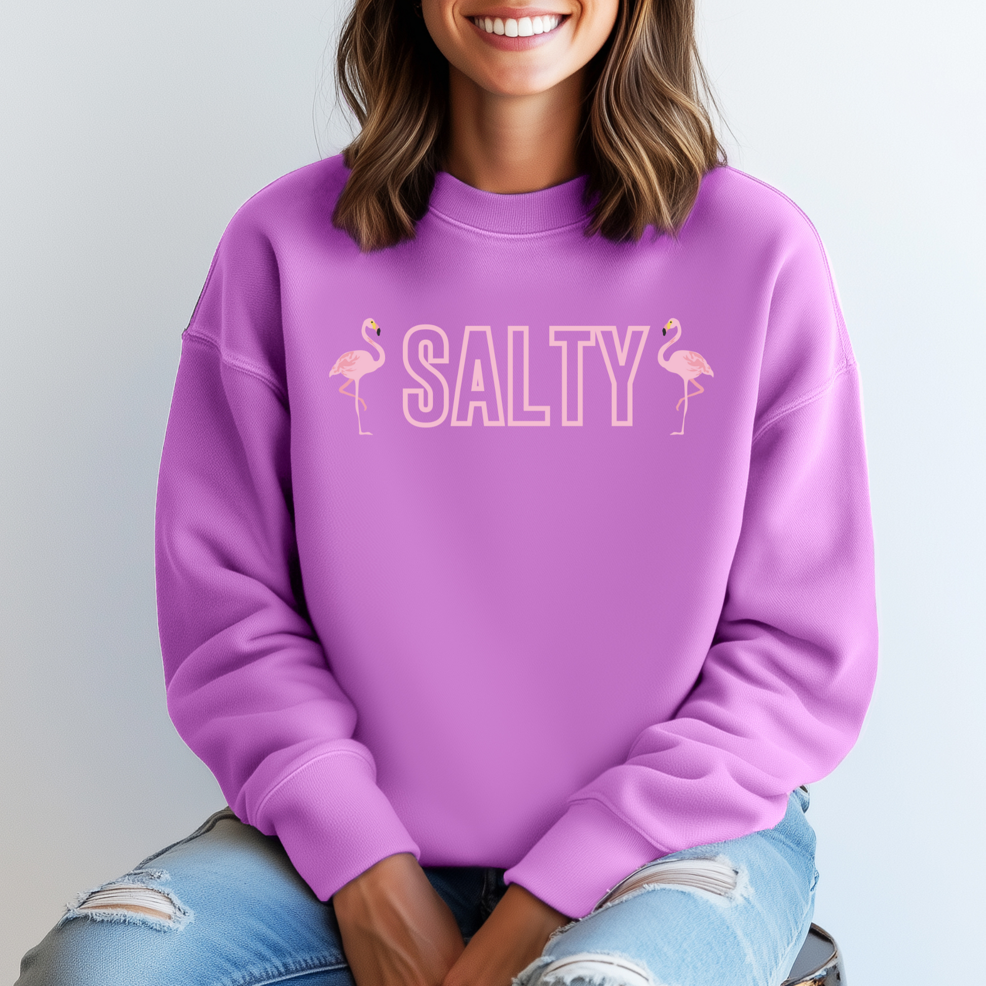 Salty Sweatshirts With Flamingos Comfort Colors gives off a relaxed and laid-back vibe, perfect for casual days or beach outings. Ideal for those who love quirky and fun designs, this sweatshirt is a great addition to anyone's wardrobe. Relevant for summer vacations, beach trips, and tropical-themed parties.
