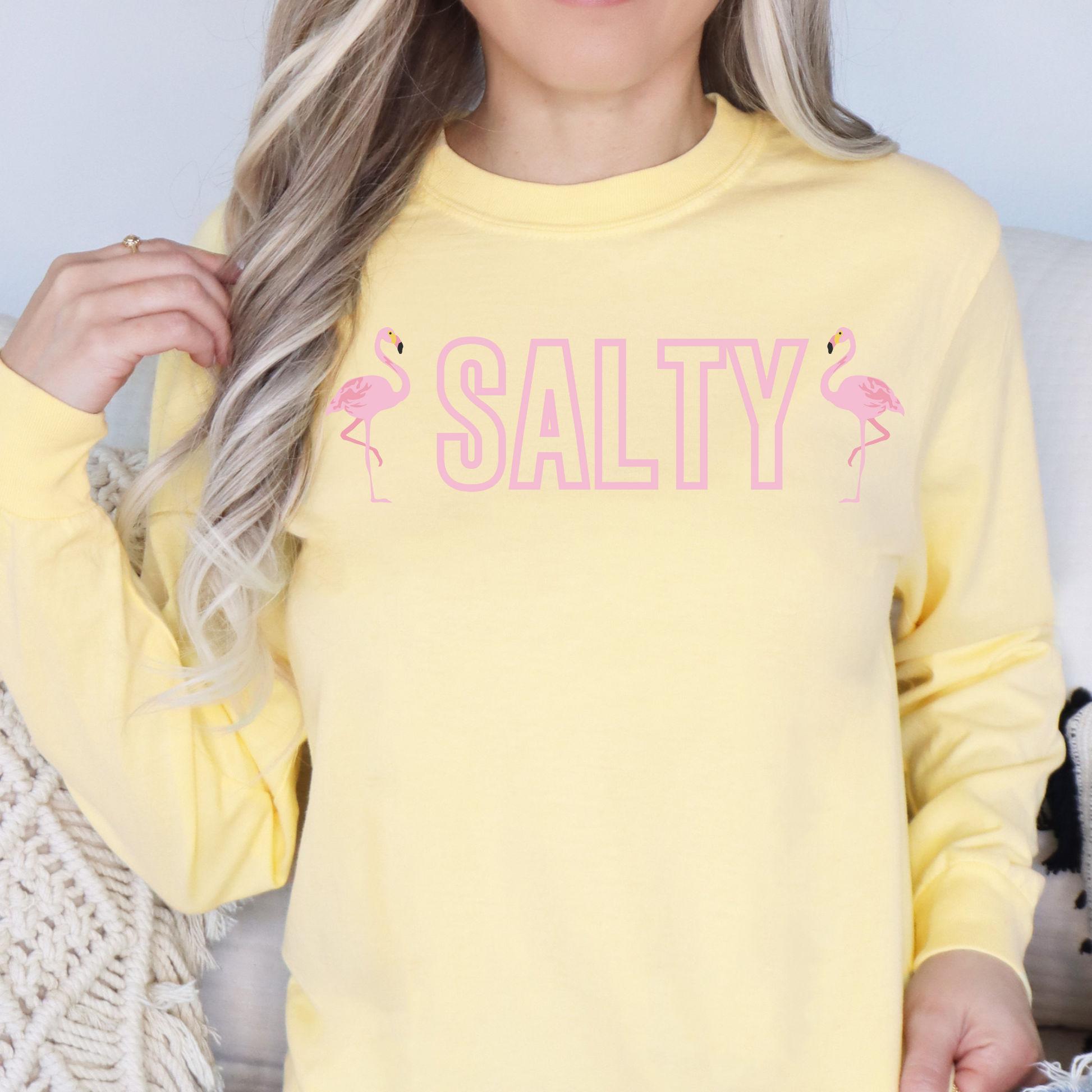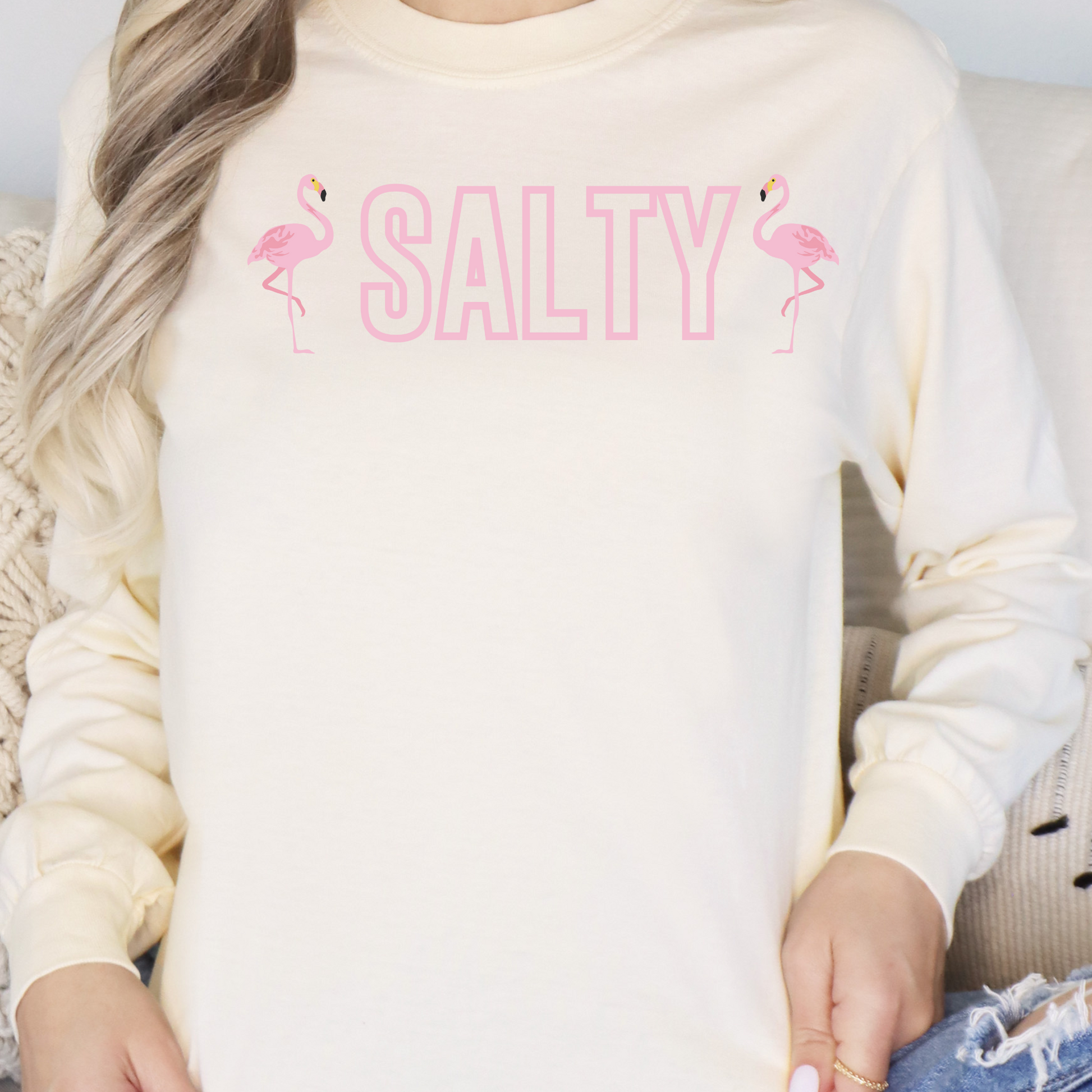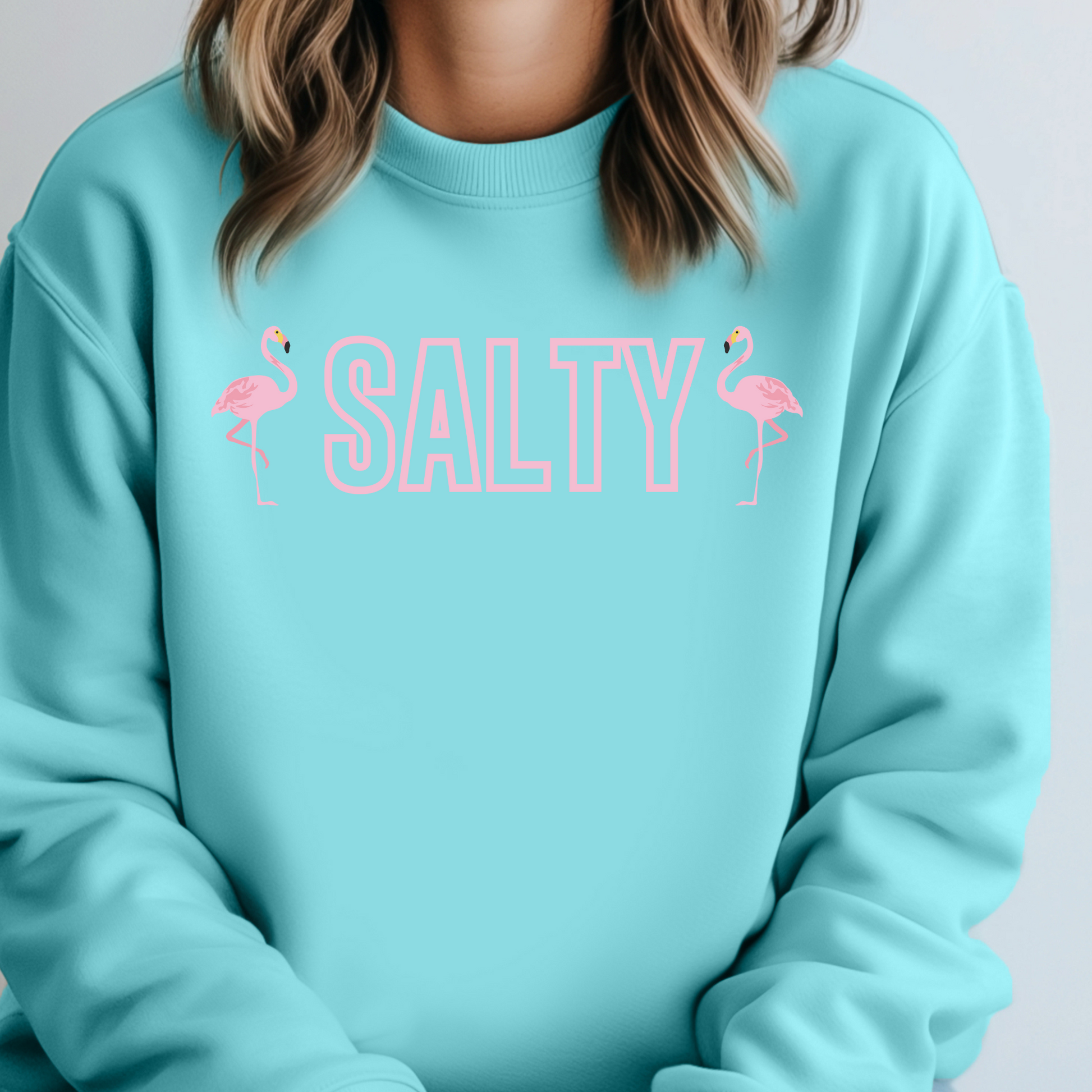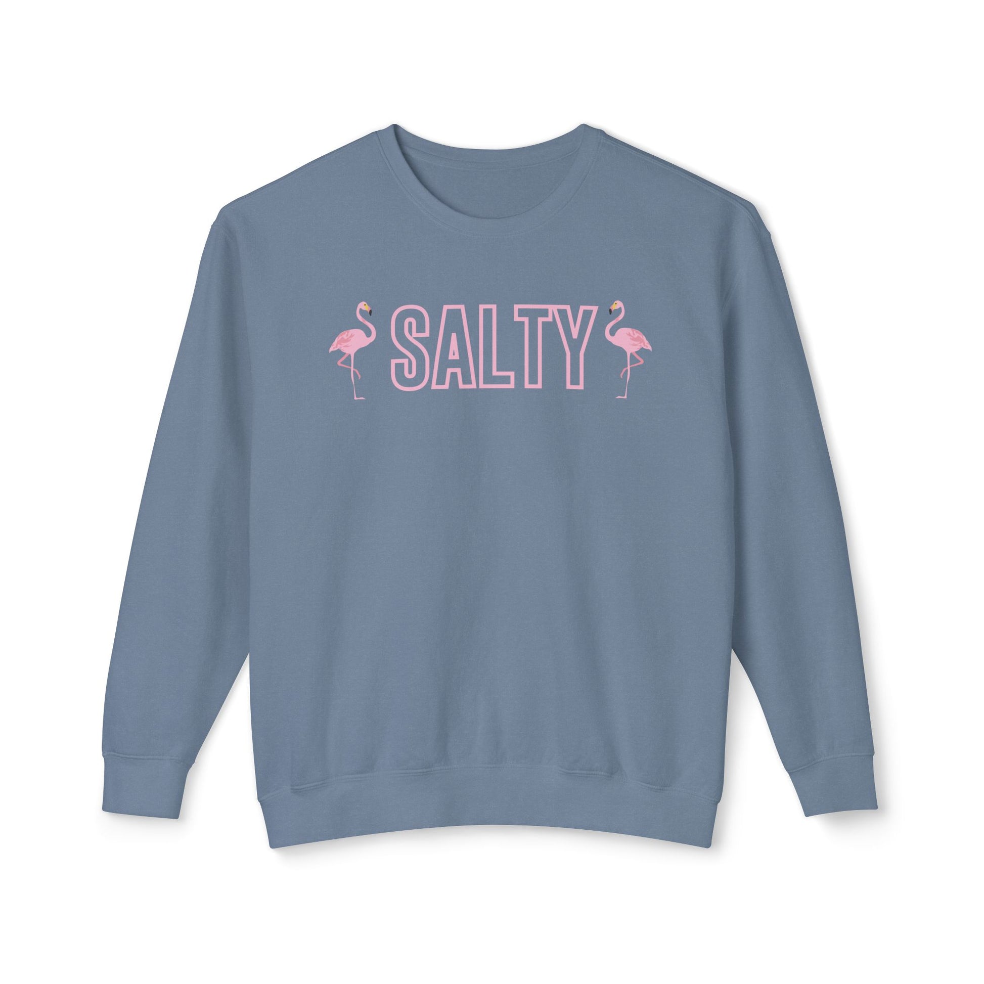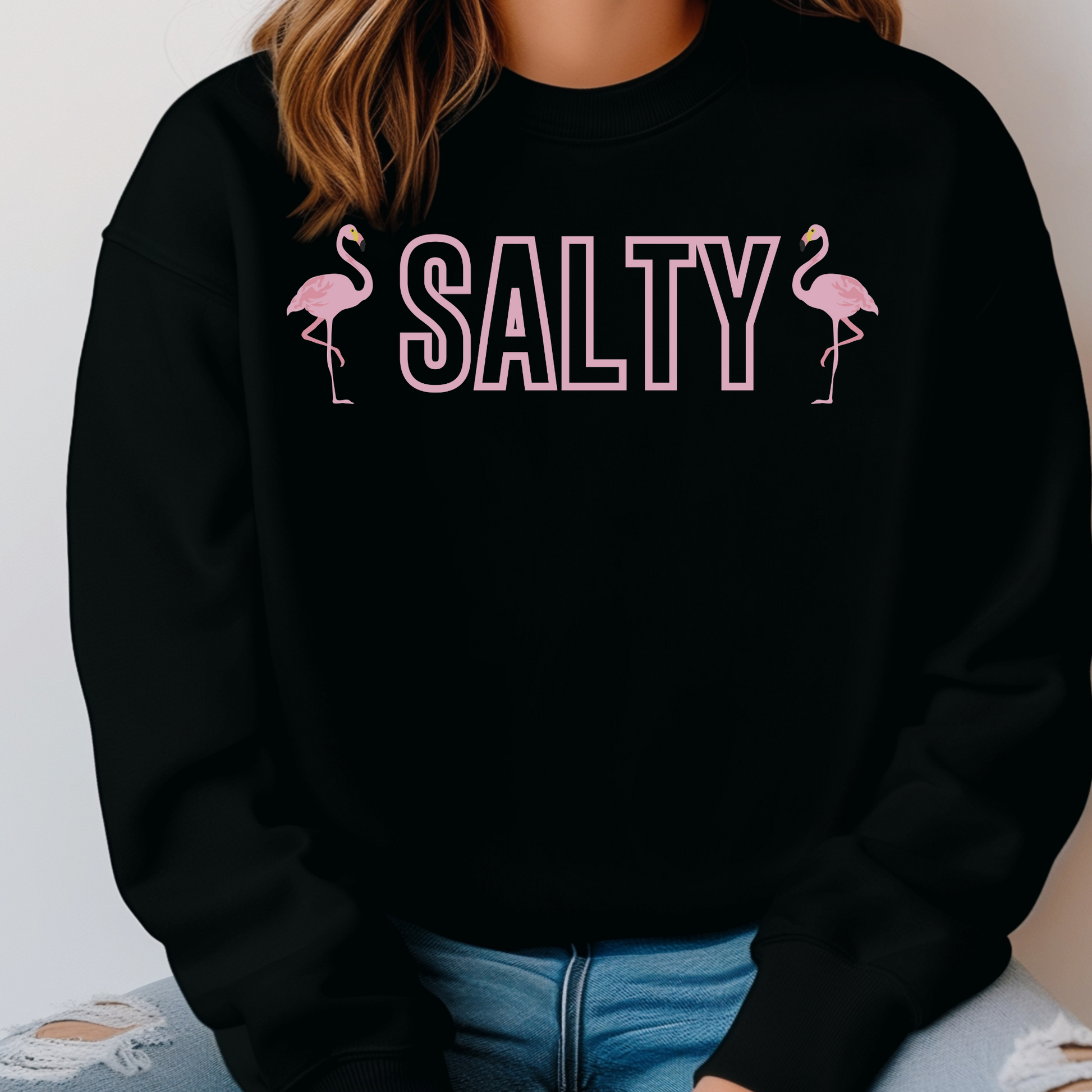 Salty Sweatshirts With Flamingos Comfort Colors gives off a relaxed and laid-back vibe, perfect for casual days or beach outings. Ideal for those who love quirky and fun designs, this sweatshirt is a great addition to anyone's wardrobe. Relevant for summer vacations, beach trips, and tropical-themed parties.