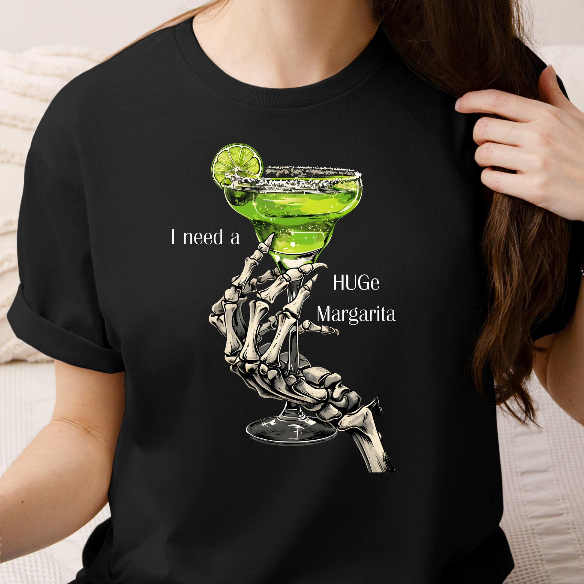 A funny Margarita T-Shirt with a skull hand design that adds a touch of humor and edginess to your wardrobe. Perfect for those who enjoy a good laugh and unique style. Ideal for casual wear or a fun night out. Relevant for fun parties as well as Cinco de Mayo celebrations and Halloween.