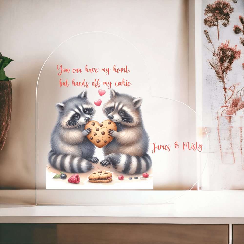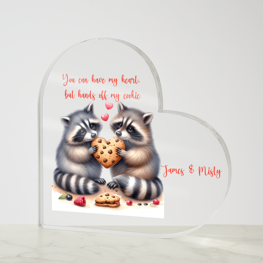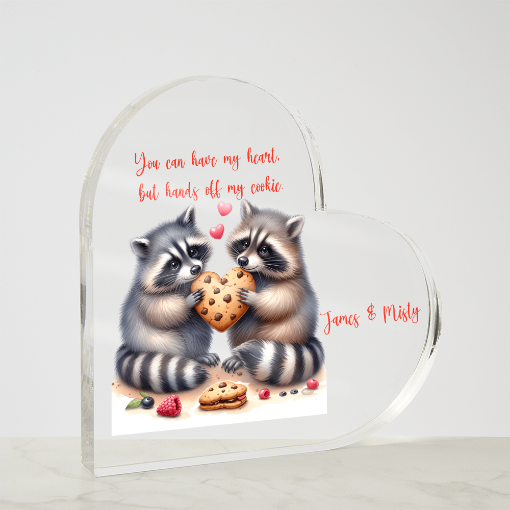 You can have my heart, but keep your hand off my cookie. These 2 adorable raccoons hold a heart cookie. Personalized with your names!